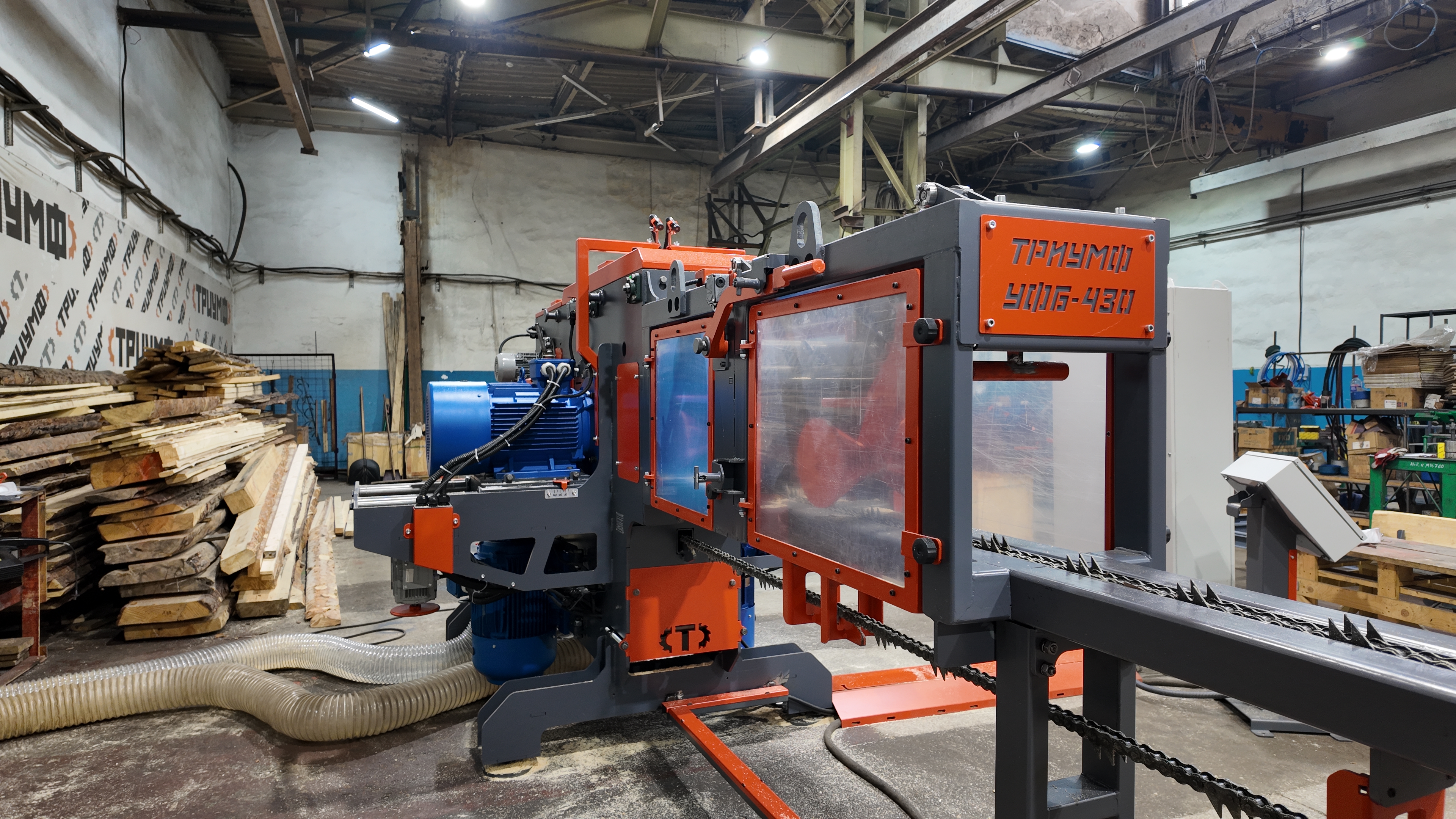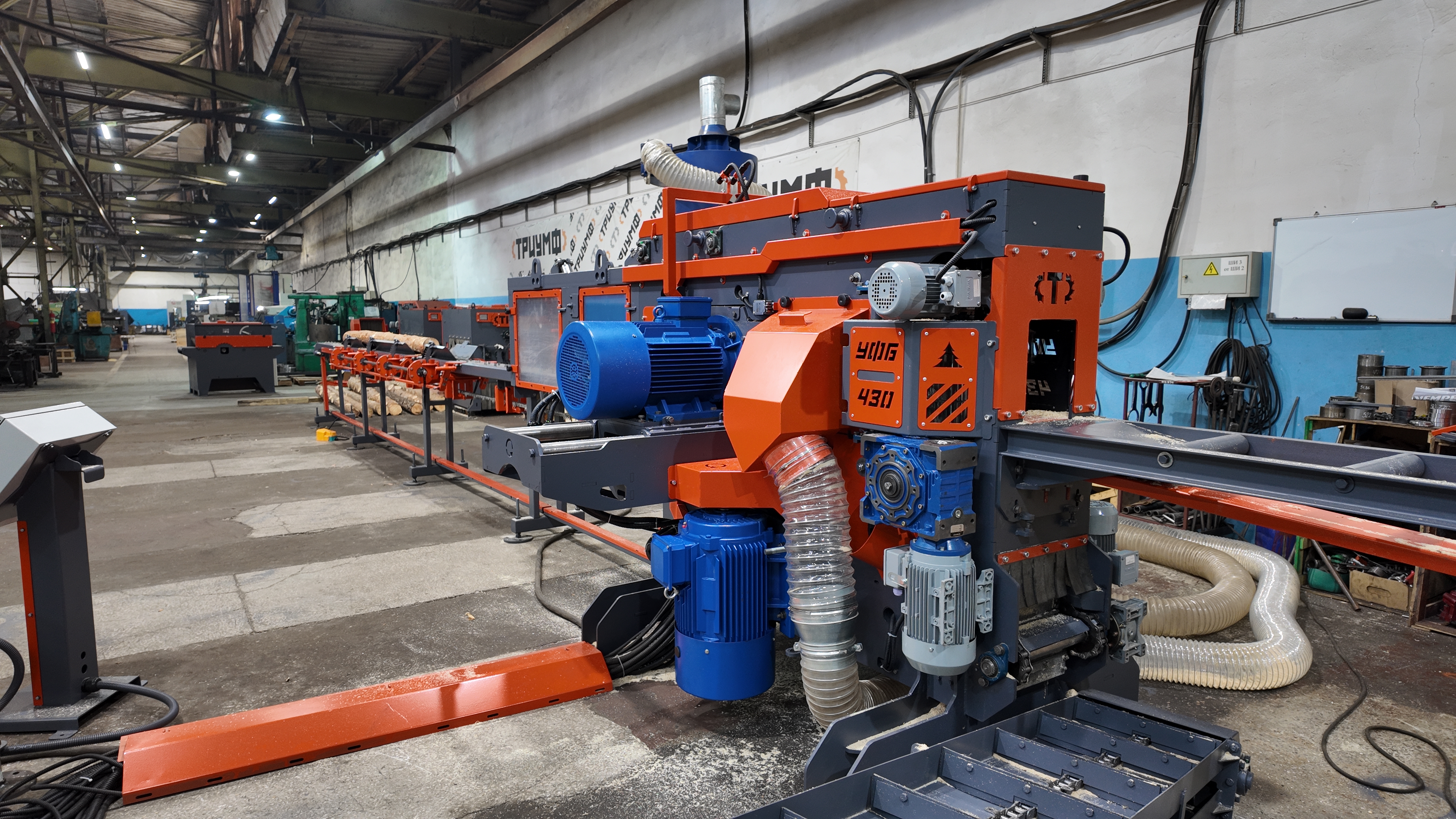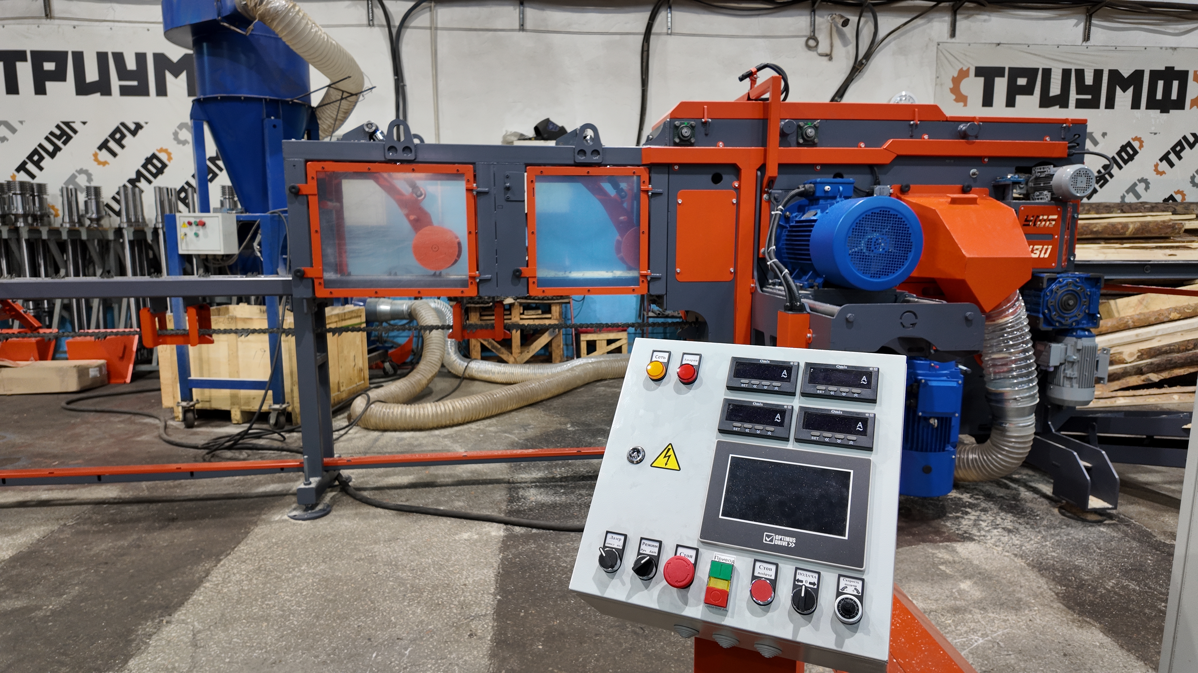 Фрезерно-брусующий станок ТРИУМФ УФБ-430 предназначен для переработки тонкомера диаметром от 80 до 280 мм на обрезную доску за один проход.